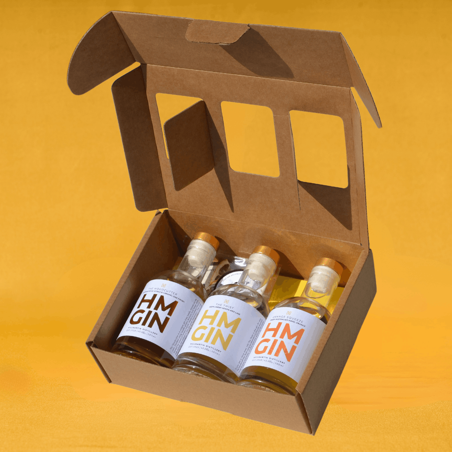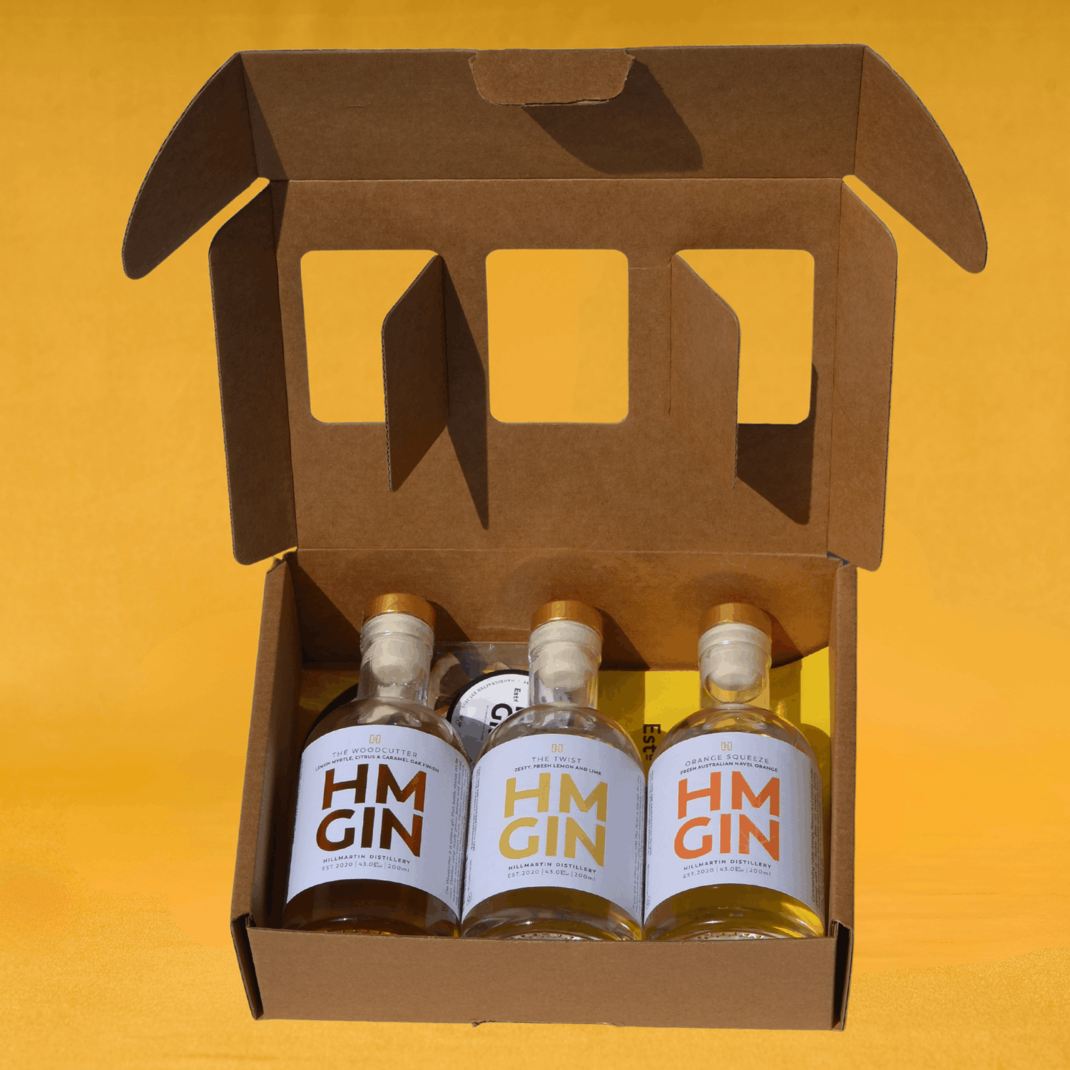 The HM Citrus Gin Gift Pack features a trio of 200ml bottles, including our distinctive Woodcutter Gin, the vibrant Twist Gin, and our best-selling Orange Squeeze Gin. Each pack comes complete with complementary HM Gin coasters and garnishes, making it the perfect gift or indulgence for yourself.